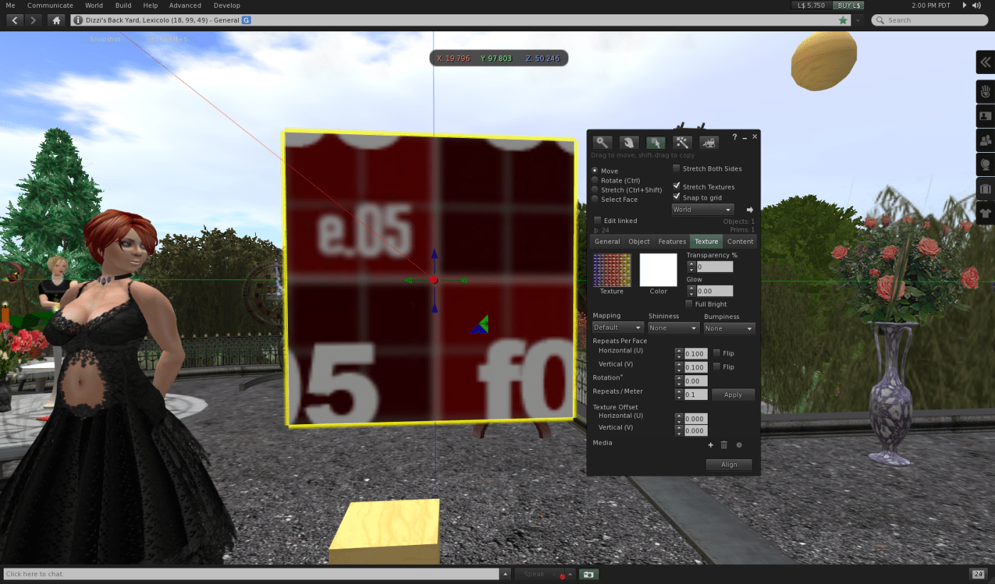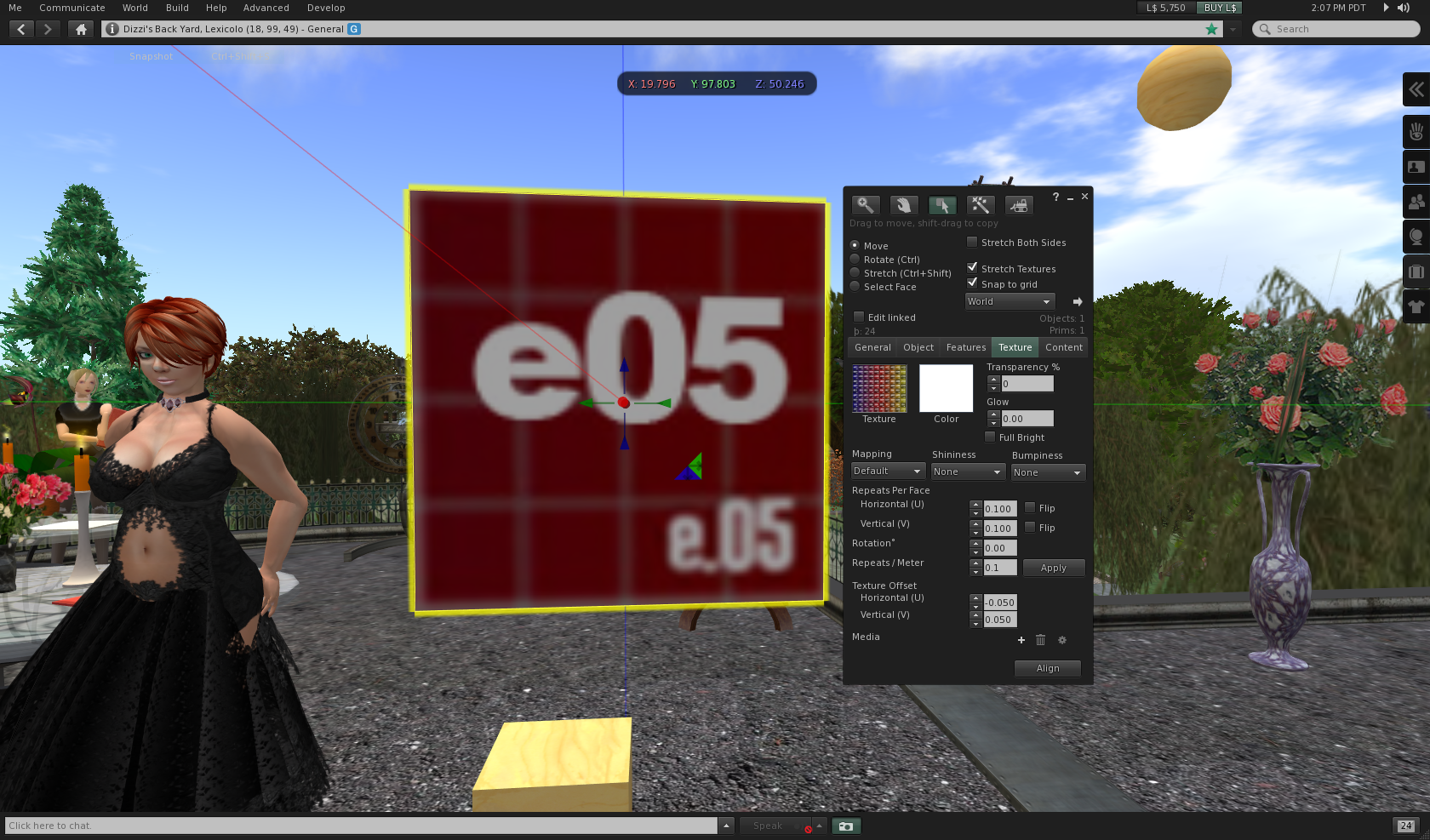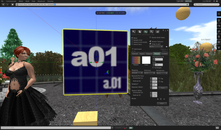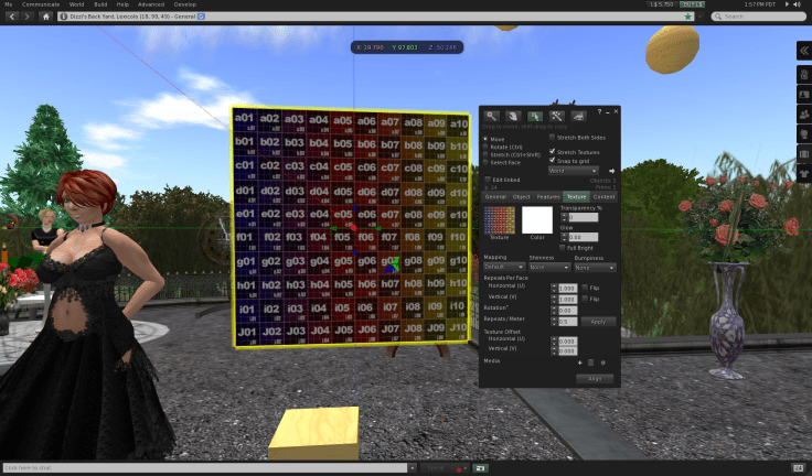 We see now that we are looking at the center of the texture. So SL textures 0,0 location is the center of the texture. One would have hoped for top left in this case, but no matter. Let us reason together … to get the a01 location, the top left of our original texture, to appear on the prim, we need its center to be at the center of the prim. The a01 is in the zeroth row, zeroth column of the texture as we would think of it. But the prim’s 0,0 is looking at 0.5, 0.5. First, let’s get the e05, now in the top left corner of our prim, to fully appear. To do that we need to move a little to the left, and a little bit up. Since each cell is 0.1 wide and high, we need to move by 0.05 in each direction … half of 0.1. We should reduce x by 0.05, and increase y by 0.05, as I see it. Sure enough, that works: