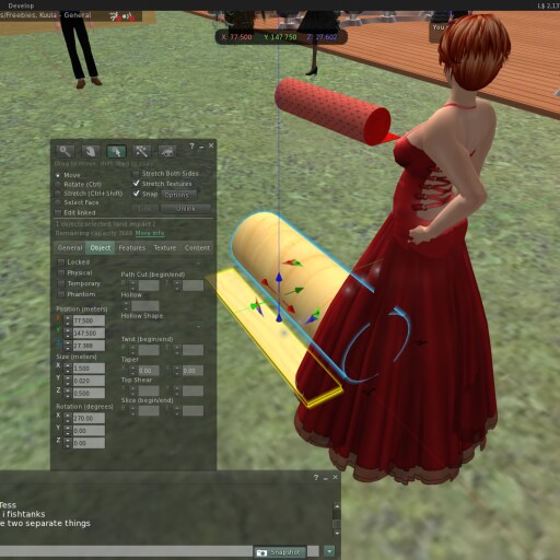 I feel the need to do a bit of thinking. The way the roll works now is that it preserves its original x and y position, and adjusts z. (Remember, Janet and reader, that to the roll, z is the direction of motion. We’ll need to keep that the same but also adjust … let me edit the object … what turns out to be negative y. Arrgh. Why? Because that happens to be the way I rotated the sliced prim. So we’ll need to take that into account in this next bit. Anyway we want to scale the prim diameter, and adjust its y height. I’ll write those in separate param sets for now.
