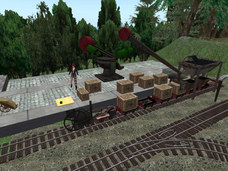 But then, when things work, you can go nuts. In a real script, one of the first things we’d do would be to replace llSetPos and llSetLocalRot with llSetLinkPrimitiveParamsFast, because that’s how you make lots of moving prims move all together and smoothly. Come to Lexicolo and find the crane that puts boxes on the train cars for an example of smoothly moving lots of prims. The featured image above shows the crane. Or look at the running gear on the Double Fairlie.