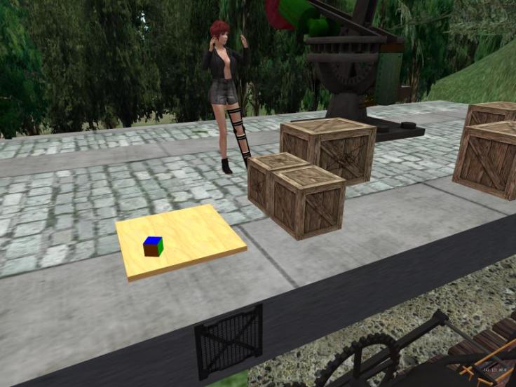 BBoy asked me to tell him how to move child prims around, since he didn’t know how to do that part. He’s a wizard with vehicles and controls, but the prim thing isn’t in his toolkit yet. So I wrote a little script to show him the rudiments of how we do it. He picked up on the idea and thinks he knows where to go next. Of course I’ll help him if he needs it. Anyway, I wanted to share with you what I showed him and talk a bit about it. I built this tiny toy object with a floor and a prim to demonstrate the technique: